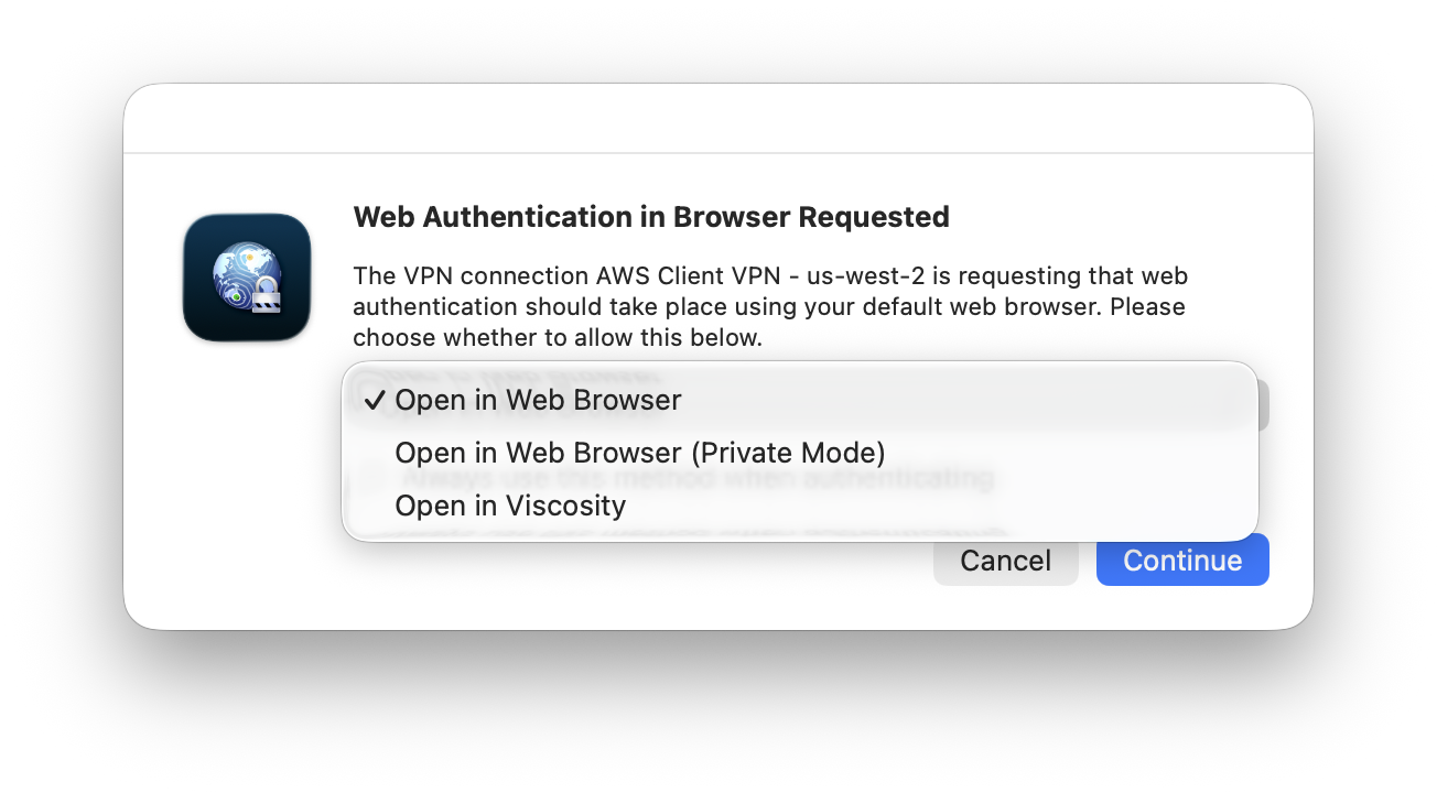 If you are not seeing the prompt when connecting to an OpenVPN server that requests web authentication, the server may be explicitly requesting "Open in Viscosity" mode by setting the "internal" flag. If you are a VPN administrator and wish for users to see the prompt, please remove this flag or specify the "external" flag.
